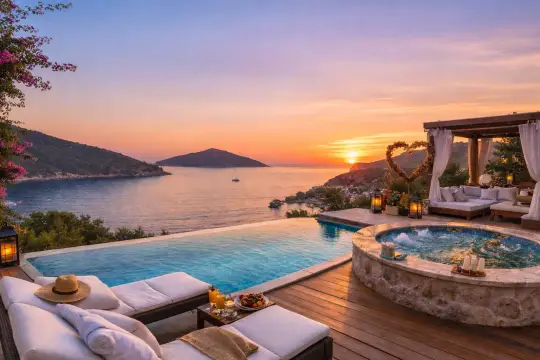 Kalkan, balayı için özellikle “manzara ve sakinlik” arayan çiftlerde çok güçlü sonuç üretir. Bölge topografyası gereği birçok konaklama seçeneği panoramik perspektif sunar; bu da balayı deneyimini “görsel olarak premium” bir seviyeye taşır. Kalkan’ın en belirgin avantajı, balayı planını konaklamanın kendisi üzerinden zenginleştirebilmesidir: manzaralı teras, özel havuz, jakuzili süit gibi unsurlar programın ana omurgasına dönüşür.