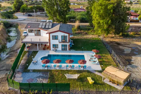 Villada yer alan özel yüzme havuzu, geniş güneşlenme terası ve yemyeşil bahçesiyle açık havada keyifli vakit geçirebilir, sevdiklerinizle unutulmaz anılar biriktirebilirsiniz. İç mekânda kullanılan kaliteli mobilyalar, modern dekorasyon detayları ve tam donanımlı mutfak; konforlu bir tatil deneyimi için her ihtiyacı karşılar.