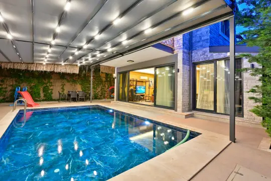 Fethiye Merkez’de konumlanan bu şık tasarımlı villa, 4 yatak odası ve 8 kişilik konaklama kapasitesiyle çekirdek ailelerden geniş ailelere, arkadaş gruplarından birlikte tatil planlayan misafir segmentlerine kadar geniş bir kullanım profiline hitap etmektedir. Mimari kurgusunda hem estetik hem de fonksiyonellik ön planda tutulan villa; ferah yaşam alanları, konfor odaklı oda planlaması ve günün her anında keyifli vakit geçirmeye imkân tanıyan dış mekân düzeniyle öne çıkar. Tamamen korunaklı özel havuz alanı, özellikle mahremiyet hassasiyeti bulunan misafirler için önemli bir avantaj sağlarken; geniş bahçesi, güneşlenme terası, dinlenme bölümleri ve jakuzi detayı villanın konfor standardını yukarı taşıyan unsurlar arasında yer alır. Şehir merkezinde konumlanmasına rağmen müstakil villa deneyimini koruyan bu özel seçenek, tatilde hem bağımsız alan kullanımı hem de yüksek erişilebilirlik bekleyen misafirler için güçlü bir alternatif oluşturmaktadır.