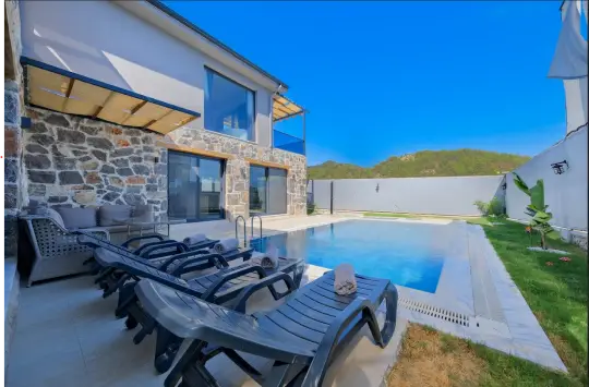Villanın tamamen korunaklı özel havuzu, misafirlere dışarıdan görünmeden rahatça vakit geçirme imkânı sunar. Ayrıca bahçe alanında yer alan jakuzi, tatilinize ekstra bir konfor ve romantizm katmaktadır. Ferah oturma alanı, tam donanımlı mutfak ve doğa manzaralı veranda, tatil boyunca keyifli anlar yaşamanız için özenle tasarlanmıştır.