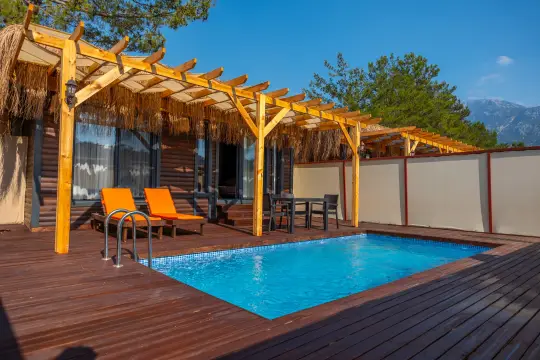 Fethiye / Ovacık’ta konumlanan 1 yatak odalı, 2 kişilik bu korunaklı balayı villası; çiftlerin mahremiyet ihtiyacını merkeze alan, sakinlik ve konfor odaklı bir konaklama kurgusuna sahiptir. Kahvaltı dahil konseptiyle sabah planlamasını kolaylaştırırken, dışarıdan minimum görünürlük sağlayan özel kullanım alanları sayesinde gün boyu size ait, huzurlu bir tatil ritmi sunar. Doğa ile bütünleşen atmosferi ve sessiz çevresi, romantik kaçamak ve balayı segmentinde beklenti–deneyim uyumunu güçlendirir.