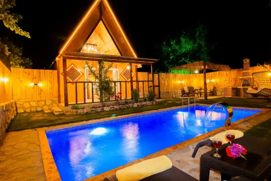 Kalkan / Çayköy mevkiinde konumlanan bu özel bungalov villa, 1 yatak odası ve 2 kişilik konaklama kapasitesiyle özellikle balayı çiftleri ve romantik tatil planlayan misafirler için ideal bir seçenek sunar. Doğa ile iç içe, sessiz ve sakin bir konumda yer alan villa; korunaklı özel havuzu ve jakuzisi sayesinde dış gözlerden uzak, tamamen mahremiyet odaklı bir konaklama deneyimi sağlar. Şehir temposundan uzaklaşıp kuş sesleriyle güne başlamak, gün batımını doğa manzarası eşliğinde karşılamak isteyen misafirler için butik ve yüksek konforlu bir alternatiftir.