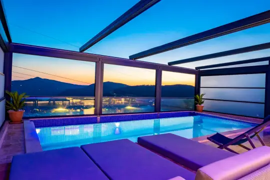 Kalkan’ın prestijli yamaç hattı Kördere’de konumlanan bu 3 yatak odalı, 6 kişilik kiralık villa; panoramik deniz manzarası, kapalı ısıtmalı havuz, jakuzi ve sauna sistemiyle dört mevsim yüksek konfor standardında bir konaklama deneyimi tasarlar. Yüksek kot avantajı sayesinde gün boyu Kalkan Körfezi’ne hâkim bir seyir sunarken; aileler ve arkadaş grupları için “konfor + mahremiyet + manzara” kriterlerini tek portföyde konsolide ederek tatil planlamasında net bir değer önerisi oluşturur.