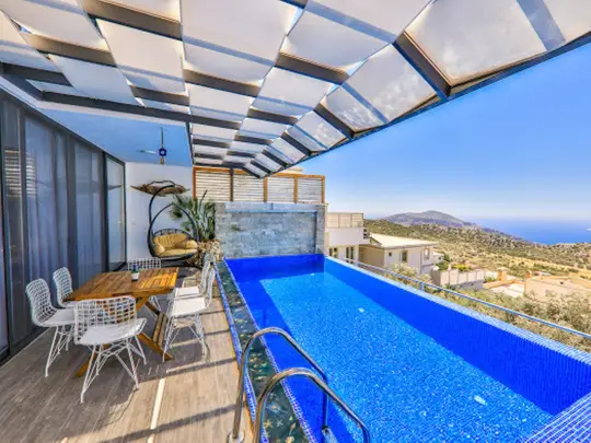 Kalkan Kördere’nin yüksek kot avantajıyla panoramik Kalkan Körfezi manzarasını merkezine alan bu 3 yatak odalı, 6 kişilik kiralık villa; Türk hamamı ve jakuzi gibi wellness odaklı donatılarıyla “lüks + konfor + erişilebilirlik” beklentisini tek çatı altında konsolide eder. Bölgenin sakin atmosferi dinlenme ve yenilenme performansını artırırken; merkeze yakın konumlandırma sayesinde restoran, plaj ve marina hattına kısa sürüş mesafesinde hızlı erişim sağlayarak tatil operasyonunu pratikleştirir.