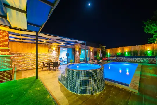 Şık ve fonksiyonel iç tasarıma sahip villada, jakuzili yatak odası ve kullanıcı dostu planlanmış yaşam alanı ile konaklama deneyimi üst segmente taşınır. Bahçe alanında yer alan dinlenme köşeleri, güneşlenme alanı ve keyifli akşam yemeklerine uygun oturma grupları, uzun süreli konaklamalar için ideal bir ortam yaratır. Kalkan merkeze ve bölgedeki gezilecek noktalara araçla kısa sürüş mesafesinde bulunan villa, hem romantik balayı tatilleri hem de çiftlere özel kaçamaklar için butik, konforlu ve izole bir konaklama çözümü sunar.