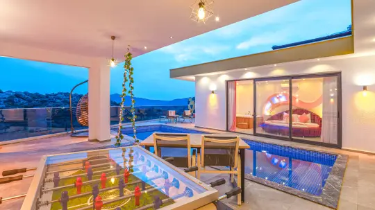 Kalkan Kördere mevkiinde konumlanan bu 1 yatak odalı, 2 kişilik kiralık balayı villası; Romantik bir kaçamak planlayan çiftler için mahremiyet, konfor ve konum avantajını tek pakette birleştirir. Dışarıdan görünürlüğü en aza indiren korunaklı havuz alanı, gün boyu özgürce vakit geçirmenize olanak tanırken balayı konseptinde kritik olan “özel alan” depolama alanını güçlü biçimde karşılar. Kördere'nin ferah atmosferi ve doğal dokusu; sakinlik ve huzur odaklı tatil kurgusu arayan misafir profili için doğru bir kimlik sunar.