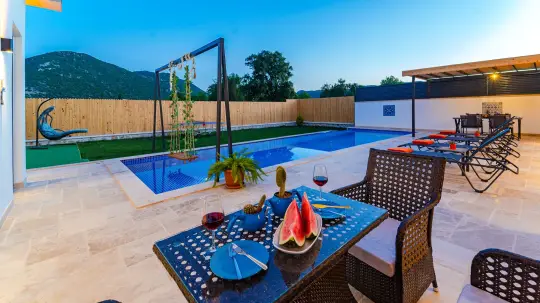 Kalkan Bezirgan mevkiinde yer alan, 2 odalı ve 4 kişilik konaklama kapasitesine sahip bu şık ve konforlu villa; doğa ile iç içe, huzurlu bir tatil arayan çekirdek aileler ve balayı çiftleri için stratejik bir konum avantajı sunar. Geniş ve korunaklı bahçe alanı sayesinde dışarıdan görünmeyen özel yaşam alanı oluşturarak muhafazakâr aileler ve gözlerden uzak tatil tercih eden misafirler için güvenli, sakin ve mahremiyet odaklı bir konaklama deneyimi sağlar.