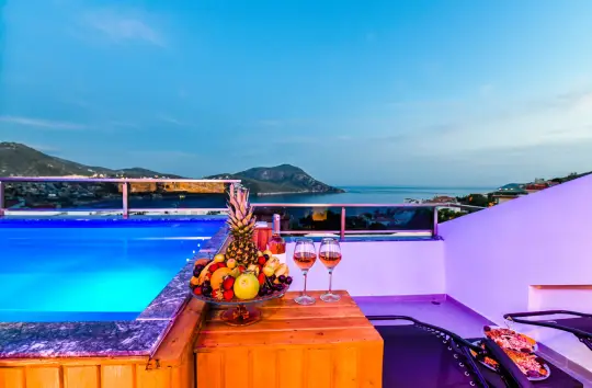 Kalkan Merkez’de yer alan kiralık villaların önemli bir kısmı özel havuzlu olup misafirlere gün boyu yalnızca kendilerine ait havuz ve güneşlenme alanı kullanma ayrıcalığı verir.