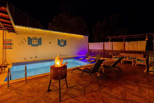 Villanın modern ve fonksiyonel iç mekân kurgusu; tam donanımlı mutfak, ferah oturma alanı ve konfor odaklı mobilya seçimiyle konaklama sürecini daha verimli ve keyifli hale getirir. Havuz terasında gün boyu dinlenme, güneşlenme ve akşam saatlerinde sakin bir ambiyansta vakit geçirme imkânı sunan bu villa, Korunaklı Havuzlu Kiralık Villalar kategorisinde değerlendirme yapan misafirler için hem estetik hem de operasyonel konfor açısından doğru bir alternatif olarak öne çıkar. Kaş merkeze ve bölgedeki koylara kısa sürüş mesafesinde yer alması ise doğa içinde sakinlik ile sosyal erişilebilirlik arasında dengeli bir tatil deneyimi sağlar